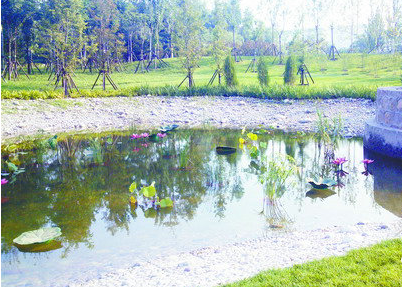 小區(qū)沿著排水道建有滲透淺溝,表面植有草皮,供雨水徑流流過時下滲.超過滲透能力的雨水則進入雨水池或人工濕地,作為水景或繼續(xù)下滲.